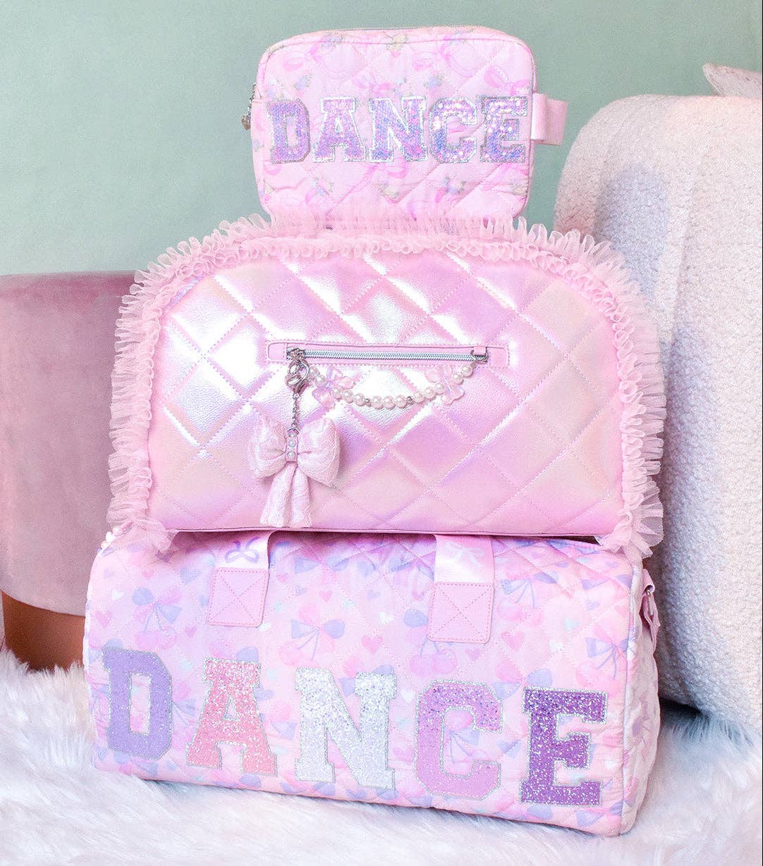 Say hey to the ultimate ballerina bag! Our quilted barrel duffle bag just got the girliest upgrade! From dance class to competitions, and everywhere else in between - they'll be carrying it all in our diamond-quilted powder pink, cherry bow printed spacious barrel duffle! Topped with bow printed handles for easy carrying & glitter varsity lettering.
