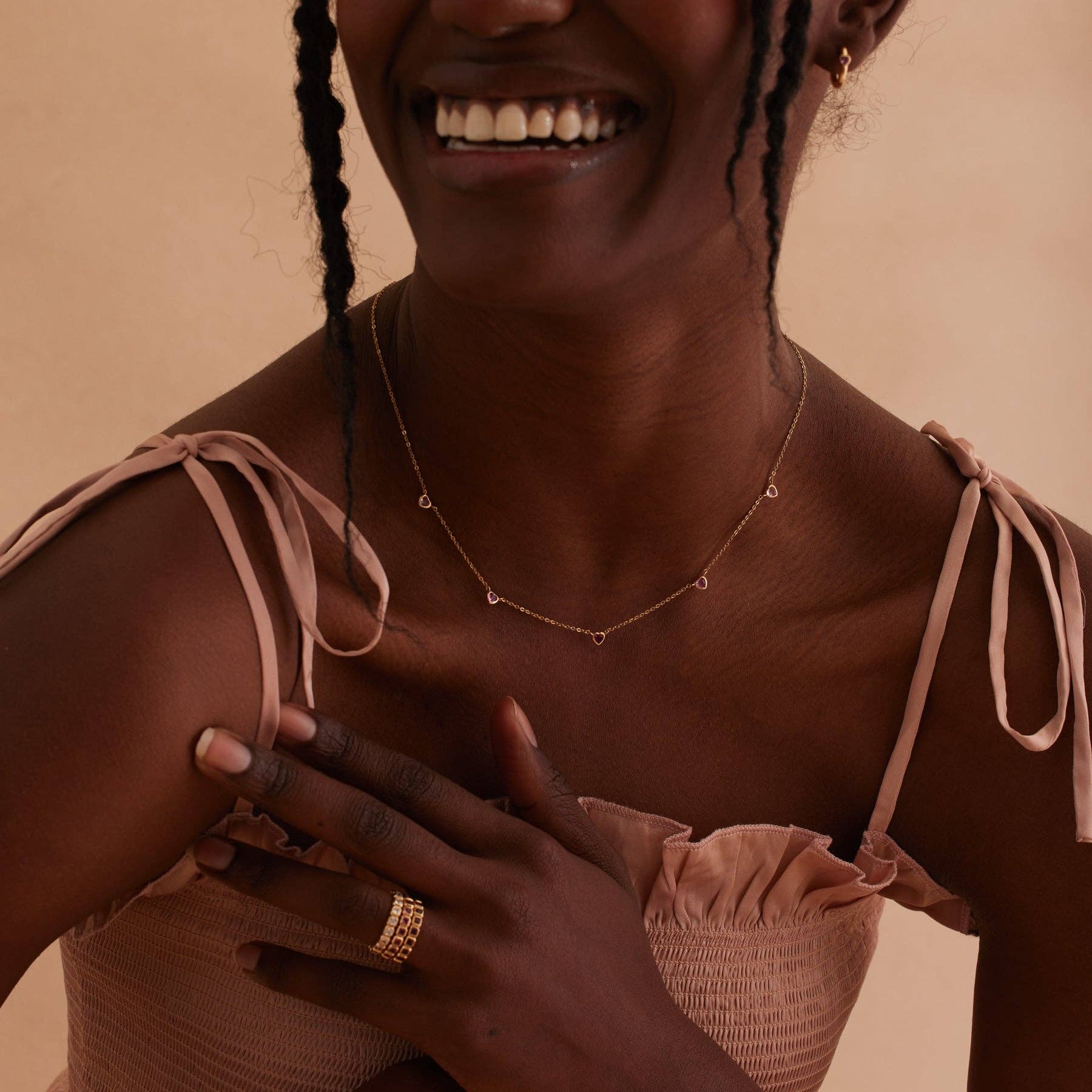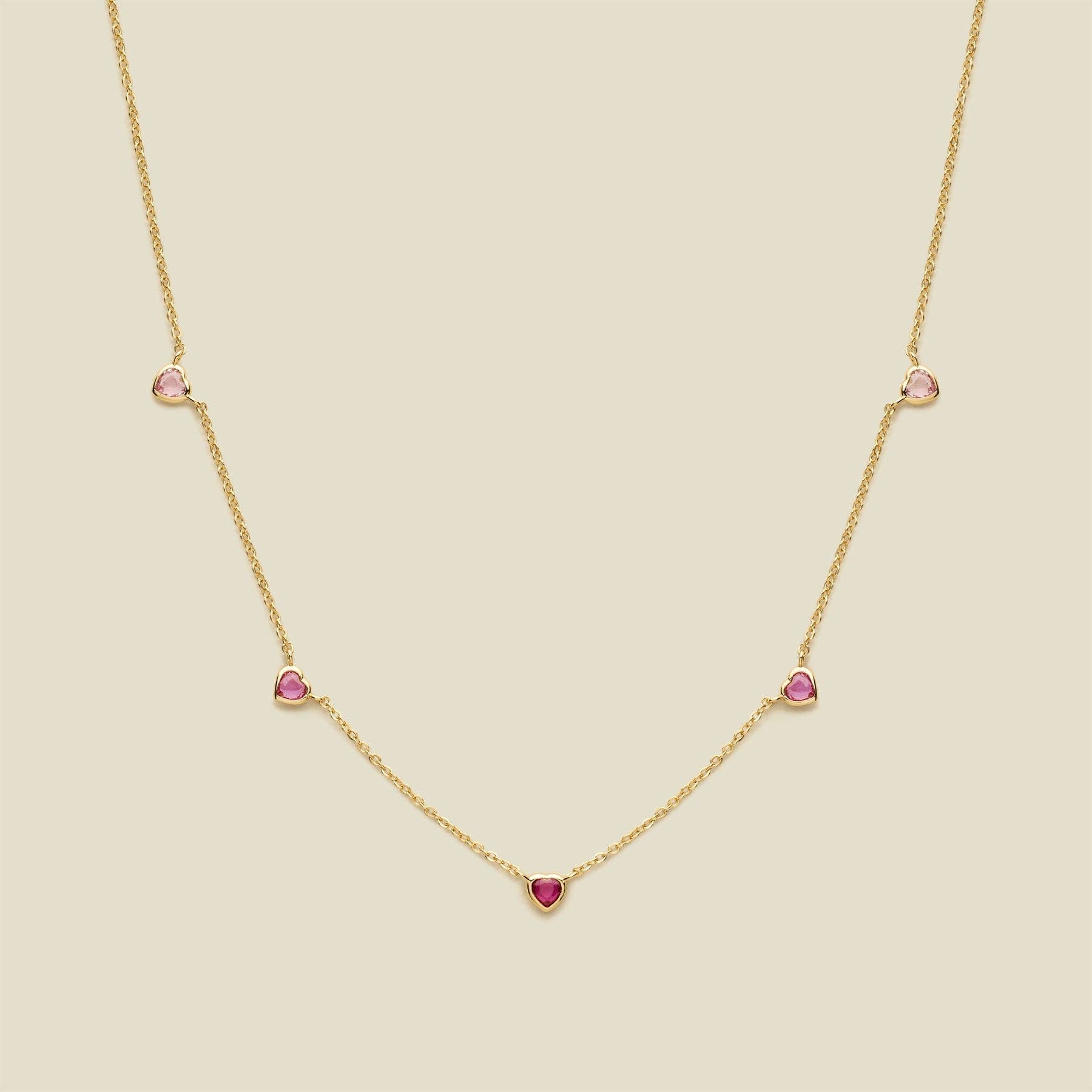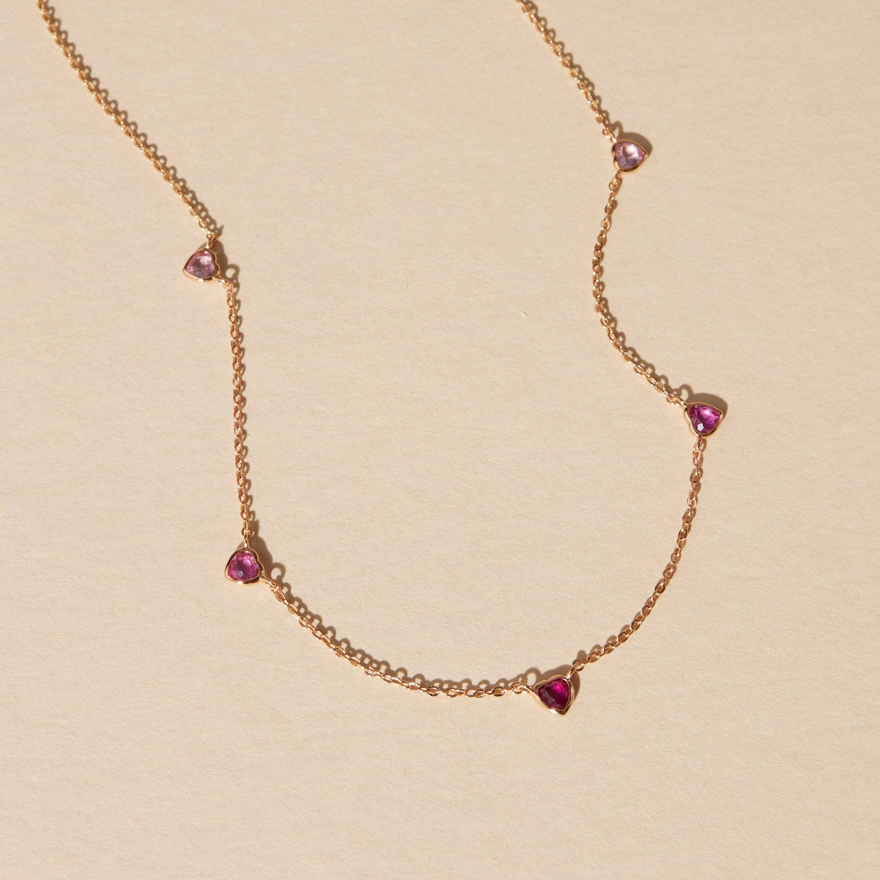 A flirty new flavor just arrived. Get a taste of this delicate necklace that features 5 floating cz hearts in graduating shades of pink for a subtle and sweet ombre effect. With that just-right bite of cute and classic, this feminine piece adds a little extra love to your look.