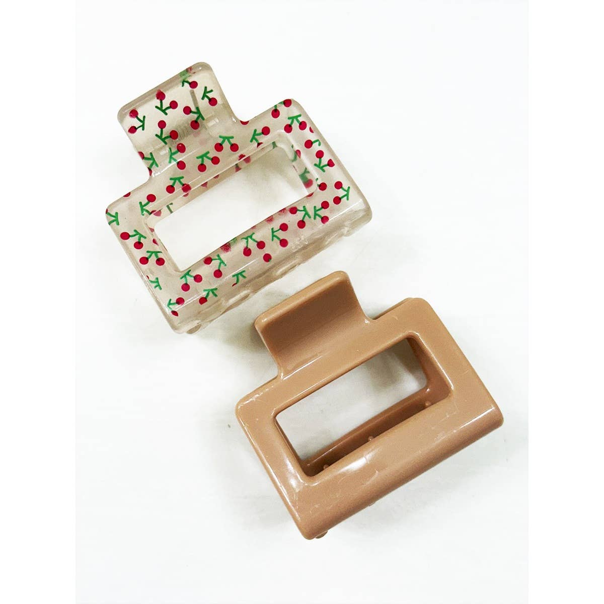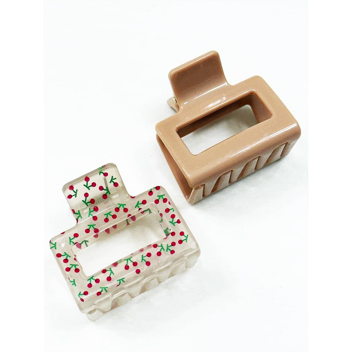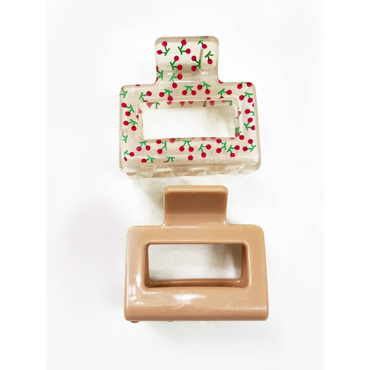 2-pcs Solid Matt and Cherry Print Combo Medium Hair Claw -The Medium claw clip is portable and compact size, you can put into a handbag and take out to use in anytime. Easy to carry, suitable for easy styling when going out. -Size: 2 Inch x 2 Inch -4 Color Assorted