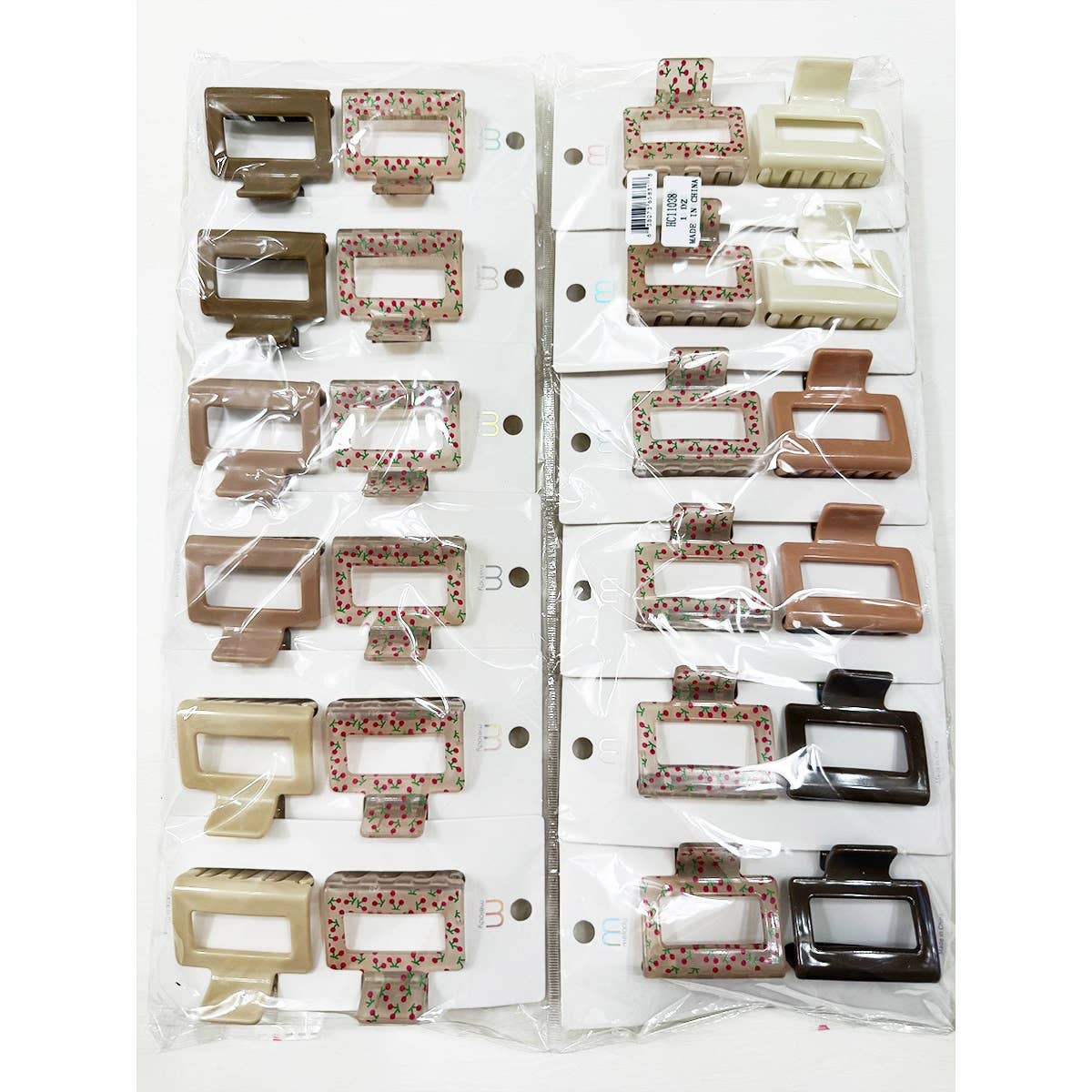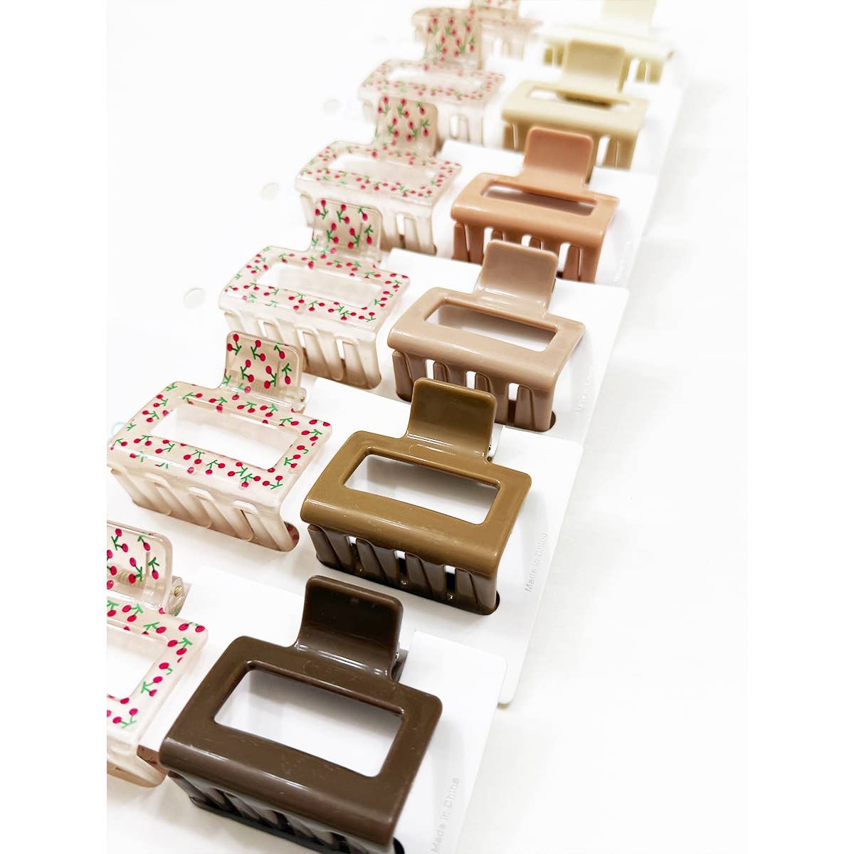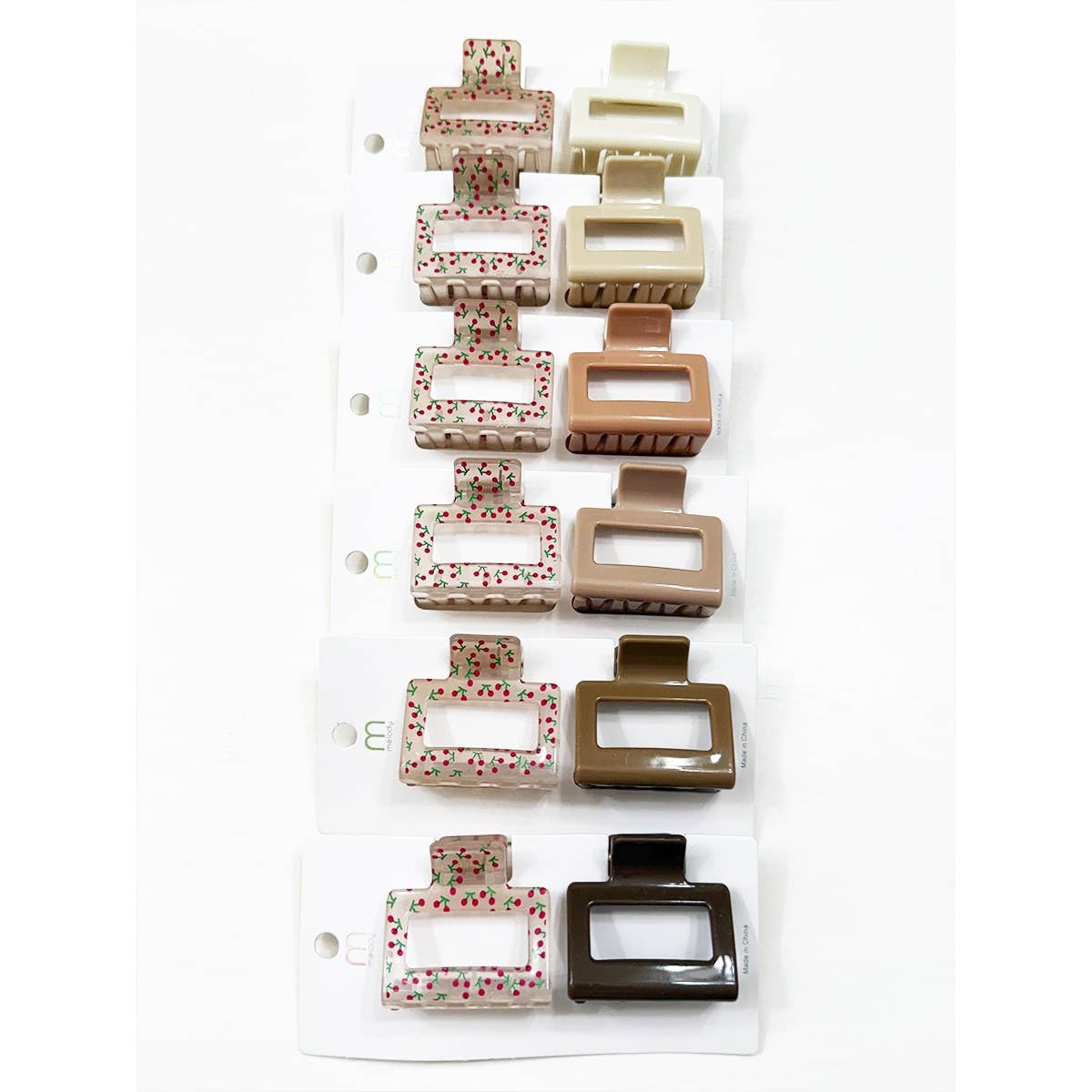 2-pcs Solid Matt and Cherry Print Combo Medium Hair Claw -The Medium claw clip is portable and compact size, you can put into a handbag and take out to use in anytime. Easy to carry, suitable for easy styling when going out. -Size: 2 Inch x 2 Inch -4 Color Assorted
