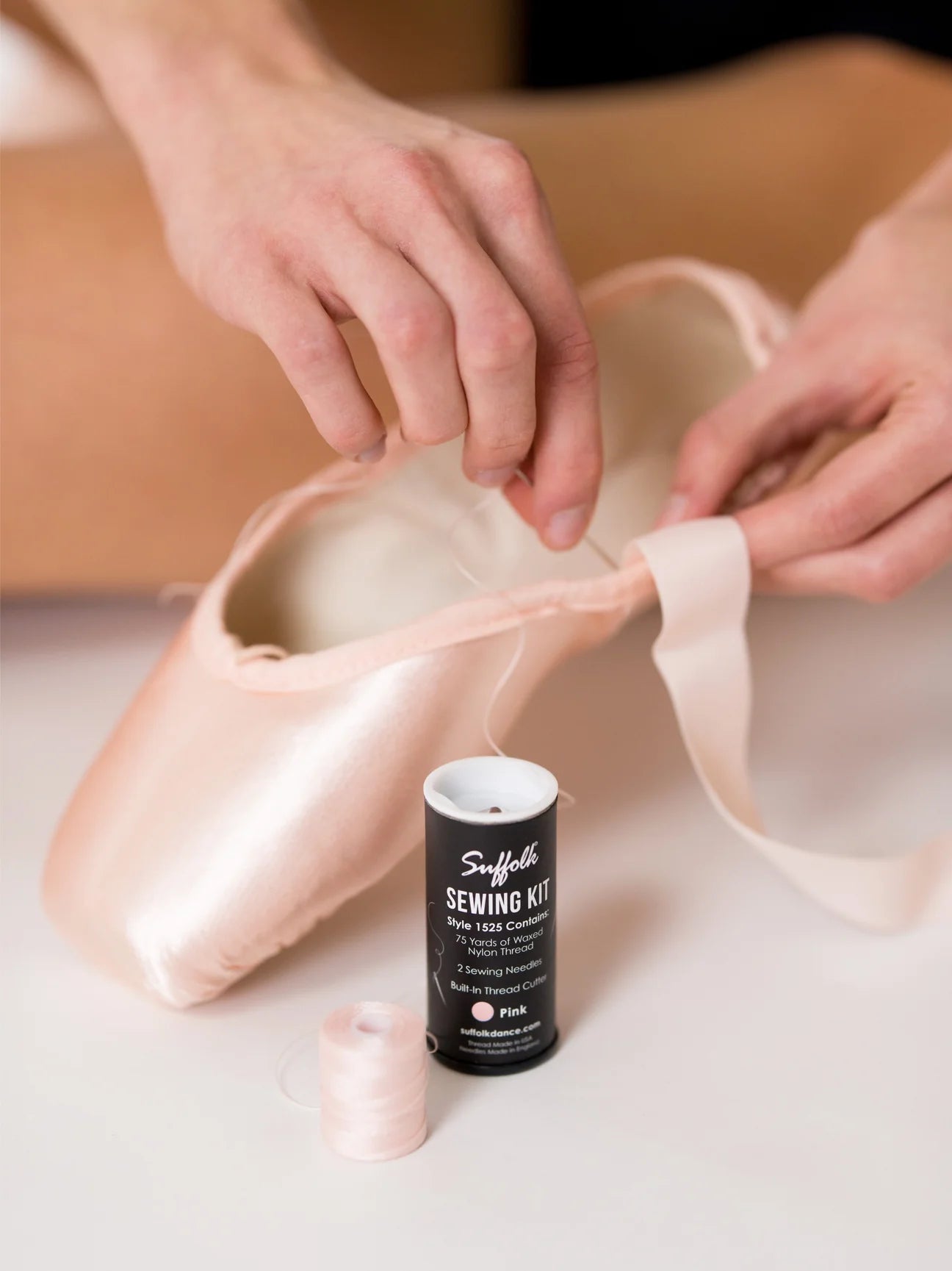 The Suffolk® Sewing Kit contains 75 yards of waxed 100% nylon thread dyed to match the satin used on Suffolk® pointe shoes, two sewing needles, and a self-contained thread cutter. The cutter is built into a top that will never rust or dull for smooth cutting.