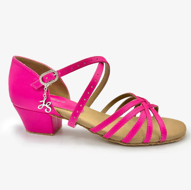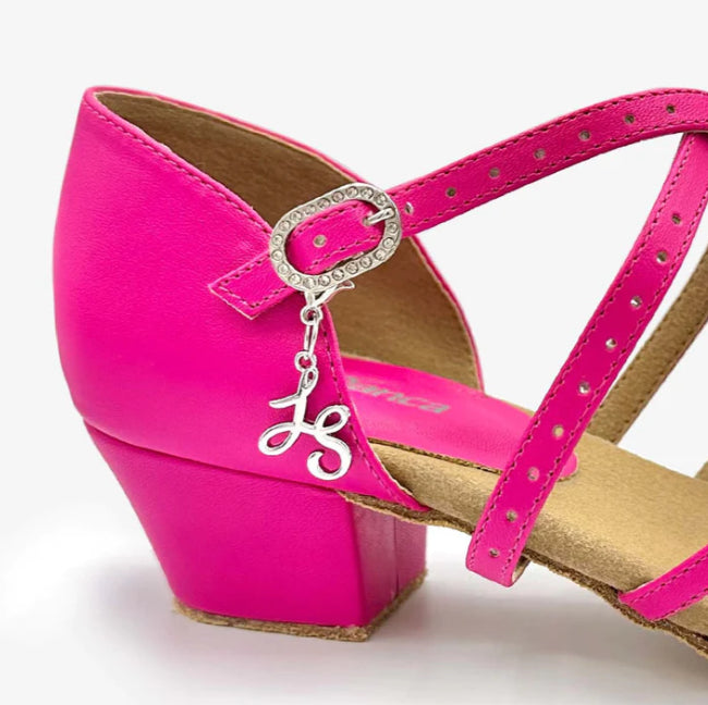 Introducing our open-toed Cuban heel from Lacey Schwimmer’s ballroom shoe collection - a dance essential suitable for dancers of all ages. With a comfortable 1 1/4" heel, this shoe offers unparalleled comfort and stability for both practice and performance. Available in three stylish colors, including vegan leather options in pink and white, as well as authentic caramel leather. As a part of Lacey Schwimmer's collection, each pair comes with an exclusive LS charm, adding a “charming” sparkle of elegance to your dance attire. Dance with confidence and style in the fabulous Mambo heels.