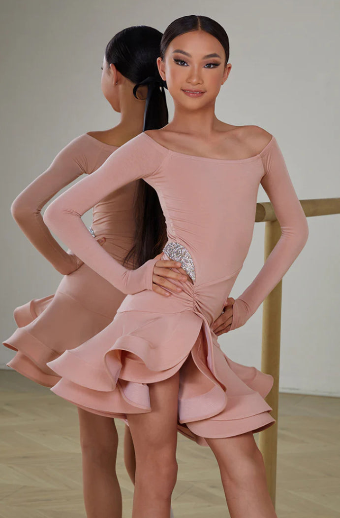 Spin with the fabulous dress! Revel in the elegance of Latin dance with our off shoulder dress, meticulously crafted to improve your natural charm and allure. The tailored boning dress flows gracefully with every movement, while the unique waist-side cutouts and jeweled waist adornment stress your figure.