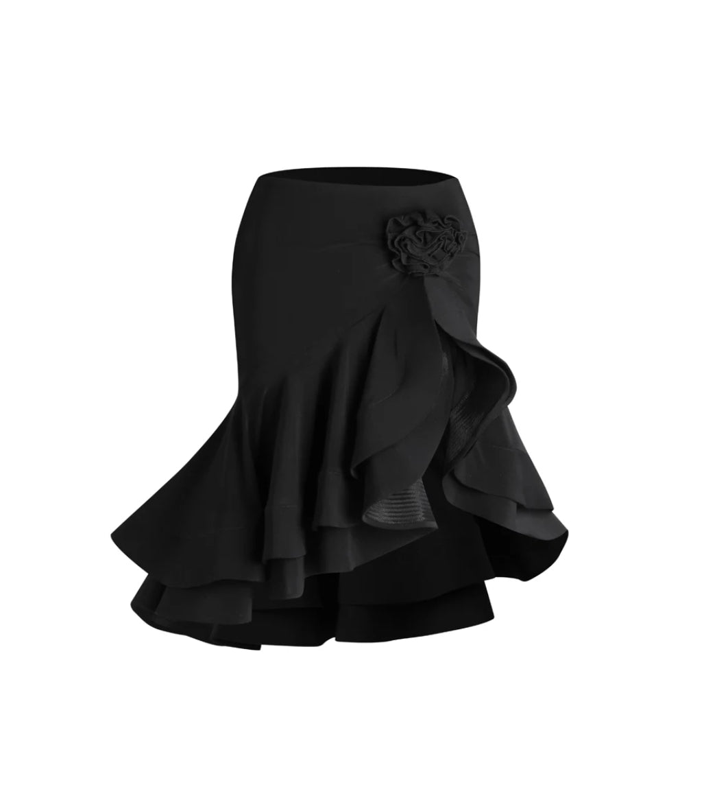 Step into the spotlight with our charming double-layer herringbone design Latin dance skirt! There is a special 3D flowers on the side, it cleverly conceals and flatters your leg shape. Radiate elegance and passion with this fabulous piece!